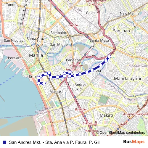See why over 2 million users trust and consider busmaps.com as the best public transport website. busmaps gives you Manila Buses suggested routes, real-time bus tracker, line route maps in Manila, and helps to find the closest San Andres Mkt. - Sta. Ana via P. Faura, P. Gil bus stops near you. No internet available? Download an offline PDF map and bus schedule for the San Andres Mkt. - Sta. Ana via P. Faura, P. Gil bus to take on your trip.