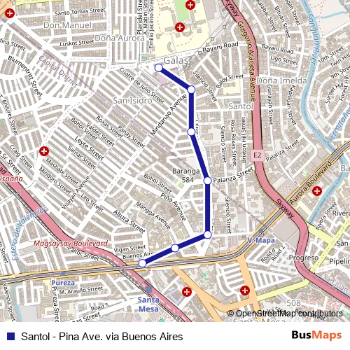 See why over 2 million users trust and consider busmaps.com as the best public transport website. busmaps gives you Manila Buses suggested routes, real-time bus tracker, line route maps in Manila, and helps to find the closest Santol - Pina Ave. via Buenos Aires bus stops near you. No internet available? Download an offline PDF map and bus schedule for the Santol - Pina Ave. via Buenos Aires bus to take on your trip.