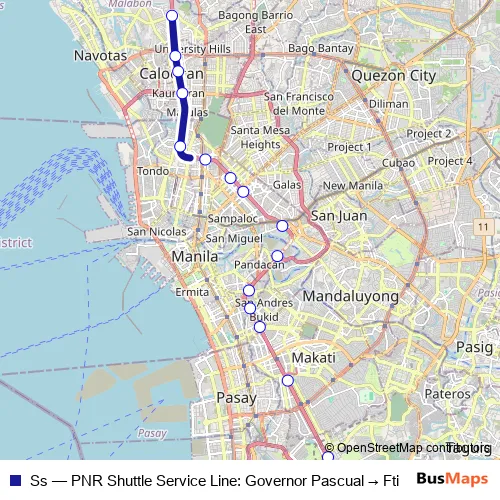 The first stop of the Ss rail route is Governor Pascual and the last stop is Nichols. Ss (PNR Shuttle Service Line: Governor Pascual → Fti) is operational during everyday.