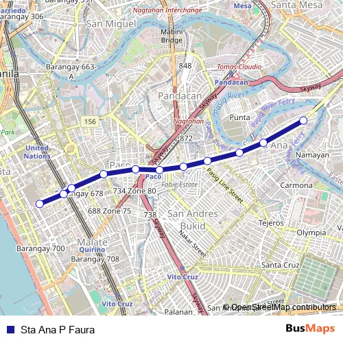 The first stop of the Sta Ana P Faura bus route is Philipine General Hospital, Pedro Gil, Manila and the last stop is Lamayan / New Panaderos Intersection, Manila. Sta Ana P Faura (Sta Ana P Faura) is operational during everyday.