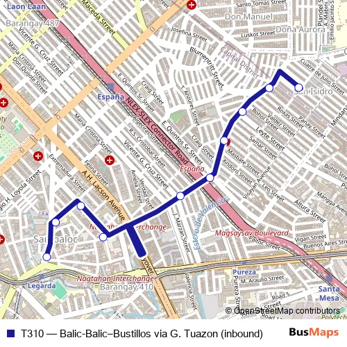 The first stop of the T310 bus route is Legarda Street/Figueras Street and the last stop is Unang Hakbang Street/Luzon Avenue. T310 (Balic-Balic–Bustillos via G. Tuazon (inbound)) is operational during everyday.