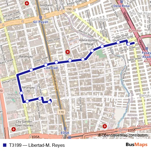 The first stop of the T3199 bus route is Valderama – M. Reyes and the last stop is P. Reyes-P. Villanueva. T3199 (Libertad-M. Reyes) is operational during everyday.