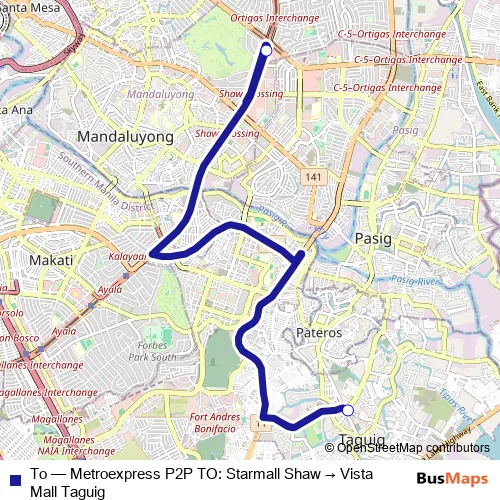 The first stop of the To bus route is Vista Mall Taguig and the last stop is Edsa-Ortigas. To (Metroexpress P2P TO: Starmall Shaw → Vista Mall Taguig) is operational during everyday.