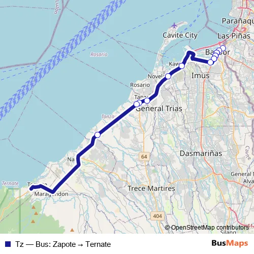 The first stop of the Tz bus route is Zapote Terminal and the last stop is Capipisa. Tz (Bus: Zapote → Ternate) is operational during everyday.