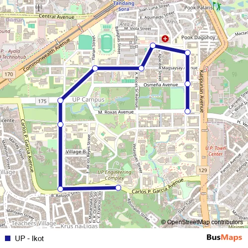 The first stop of the UP - Ikot bus route is UP College of Education, A. Ma. Regidor St / Roxas Ave Intersection, Quezon City, Manila and the last stop is C.P. Garcia Av Quezon City, Manila. UP - Ikot is operational during everyday.