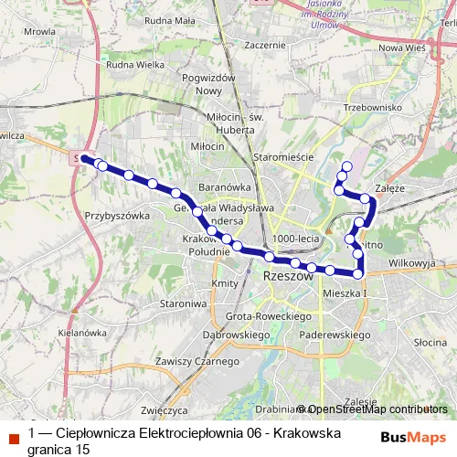 Bus 1 - Ciepłownicza Elektrociepłownia 06 - Krakowska granica 15 in Rzeszow: Stops & Timetable