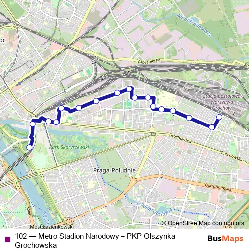 The first stop of the 102 bus route is PKP Olszynka Grochowska and the last stop is Metro Stadion Narodowy. 102 (Metro Stadion Narodowy – PKP Olszynka Grochowska) is operational during everyday.