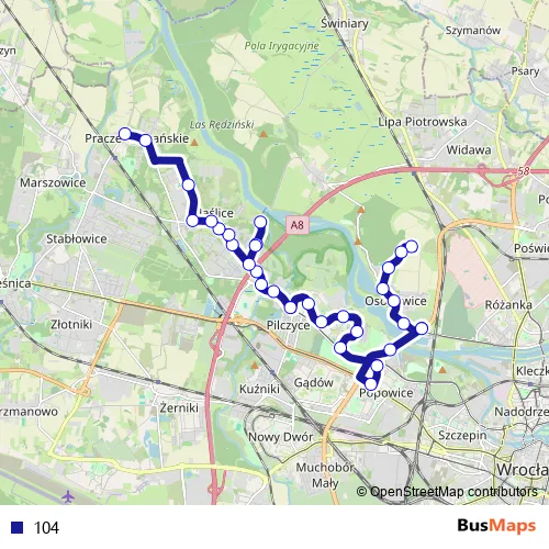 The first stop of the 104 bus route is Ślazowa and the last stop is Pracze Odrzańskie. 104 is operational during everyday.