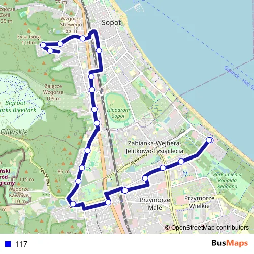 The first stop of the 117 bus route is Jelitkowo Kapliczna 03 and the last stop is Sopot Osiedle Mickiewicza 01. 117 is operational during everyday.