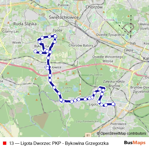 The first stop of the 13 bus route is Ligota Dworzec Pkp and the last stop is Bykowina Grzegorzka. 13 (Ligota Dworzec PKP - Bykowina Grzegorzka) is operational during everyday.