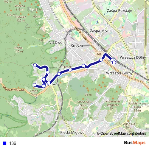 The first stop of the 136 bus route is Wrzeszcz PKP 06 and the last stop is Niedźwiednik 02. 136 is operational during everyday.