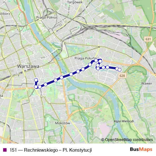The first stop of the 151 bus route is Rechniewskiego and the last stop is Pl. Konstytucji. 151 (Rechniewskiego – Pl. Konstytucji) is operational during everyday.