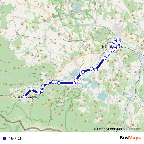 The first stop of the 160109 bus route is Szklarska Poreba, Plac PKS (Busbahnhof) and the last stop is Jelenia Gora, Dw. Autobusowy. 160109 is operational during everyday.