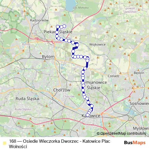The first stop of the 168 bus route is Osiedle Wieczorka Dworzec and the last stop is Katowice Plac Wolności. 168 (Osiedle Wieczorka Dworzec - Katowice Plac Wolności) is operational during on weekdays.