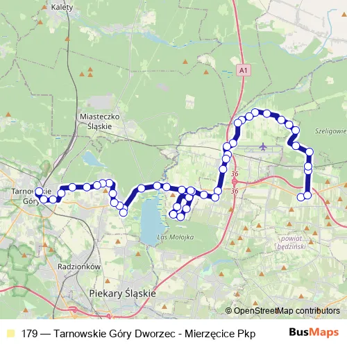 The first stop of the 179 bus route is Mierzęcice Kosmiczna and the last stop is Tarnowskie Góry Dworzec. 179 (Tarnowskie Góry Dworzec - Mierzęcice Pkp) is operational during everyday.