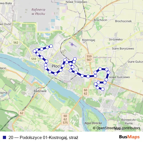 The first stop of the 20 bus route is Kostrogaj, straż and the last stop is Pniewskiego. 20 (Podolszyce 01-Kostrogaj, straż) is operational during everyday.