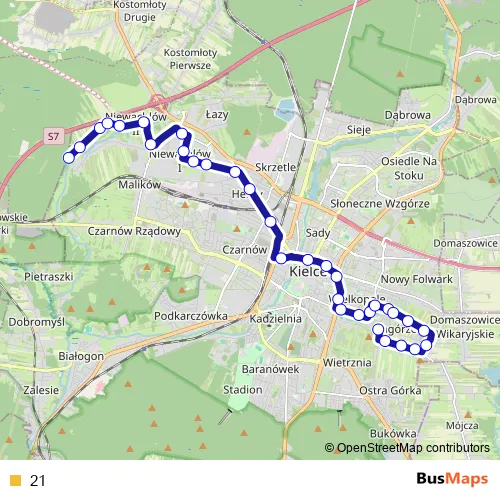 See why over 2 million users trust and consider busmaps.com as the best public transport website. busmaps gives you Kielce Buses suggested routes, real-time bus tracker, line route maps in Kielce, and helps to find the closest 21 bus stops near you. No internet available? Download an offline PDF map and bus schedule for the 21 bus to take on your trip.