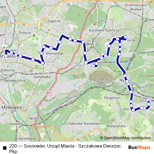The first stop of the 220 bus route is Szczakowa Dworzec Pkp and the last stop is Sosnowiec Urząd Miasta. 220 (Sosnowiec Urząd Miasta - Szczakowa Dworzec Pkp) is operational during everyday.