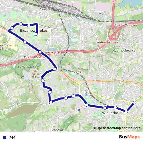 The first stop of the 244 bus route is Nowy Bieżanów Południe and the last stop is Wieliczka Kampus. 244 is operational during everyday.