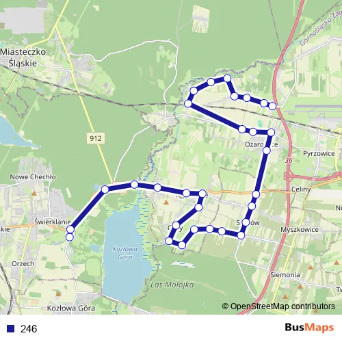 The first stop of the 246 bus route is Ożarowice Punkt Widokowy and the last stop is Świerklaniec Park. 246 is operational during on weekdays.