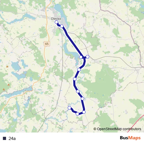 The first stop of the 24a bus route is Olecko, Wojska Polskiego - Dworzec and the last stop is Gąsiorówko. 24a is operational during everyday.