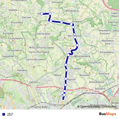 The first stop of the 257 bus route is Górka Narodowa P+R and the last stop is Narama Remiza. 257 is operational during everyday.