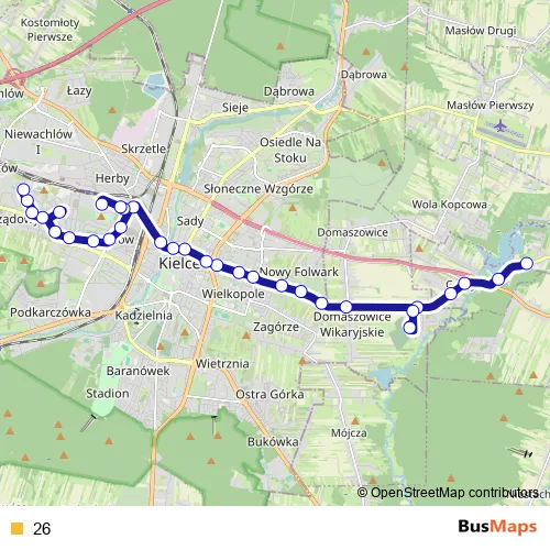 See why over 2 million users trust and consider busmaps.com as the best public transport website. busmaps gives you Kielce Buses suggested routes, real-time bus tracker, line route maps in Kielce, and helps to find the closest 26 bus stops near you. No internet available? Download an offline PDF map and bus schedule for the 26 bus to take on your trip.