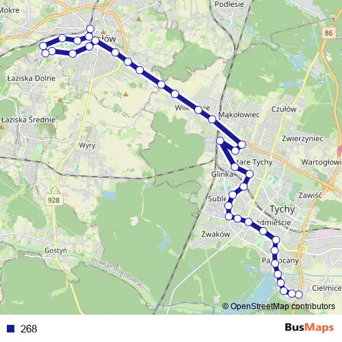 See why over 2 million users trust and consider busmaps.com as the best public transport website. busmaps gives you Tychy Buses suggested routes, real-time bus tracker, line route maps in Tychy, and helps to find the closest 268 bus stops near you. No internet available? Download an offline PDF map and bus schedule for the 268 bus to take on your trip.