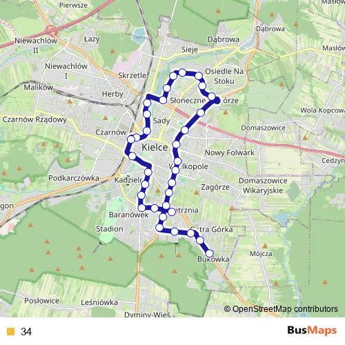 See why over 2 million users trust and consider busmaps.com as the best public transport website. busmaps gives you Kielce Buses suggested routes, real-time bus tracker, line route maps in Kielce, and helps to find the closest 34 bus stops near you. No internet available? Download an offline PDF map and bus schedule for the 34 bus to take on your trip.
