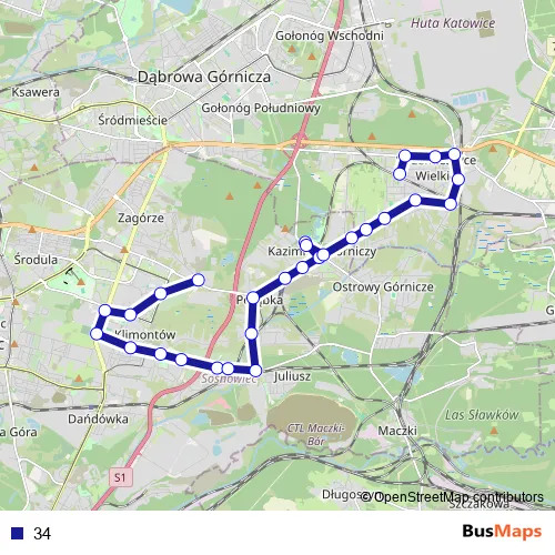 The first stop of the 34 bus route is Zagórze Zajezdnia and the last stop is Strzemieszyce Dworzec Północny. 34 is operational during everyday.