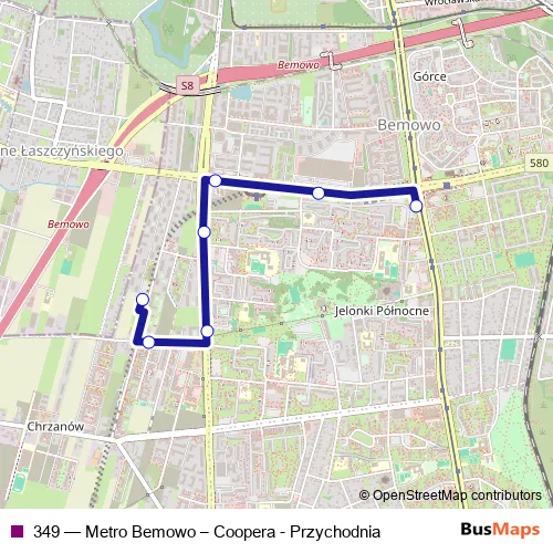 The first stop of the 349 bus route is Coopera - Przychodnia and the last stop is Metro Bemowo. 349 (Metro Bemowo – Coopera - Przychodnia) is operational during on weekdays.