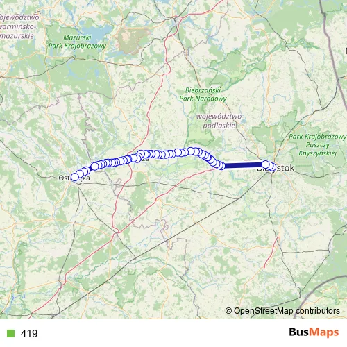 The first stop of the 419 bus route is Białystok D.A. and the last stop is Ostrołęka, D.A.. 419 is operational during on weekdays.