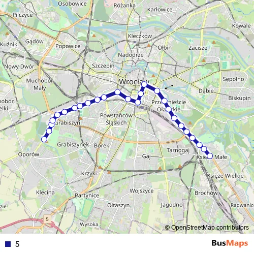 The first stop of the 5 tram route is Oporów and the last stop is Księże Małe. 5 is operational during everyday.