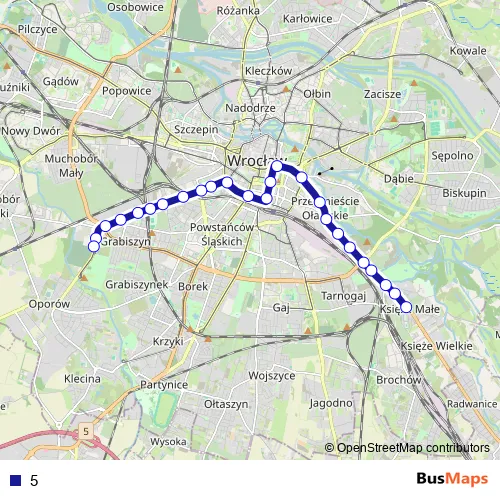 The first stop of the 5 tram route is Księże Małe and the last stop is Grabiszyńska (Cmentarz). 5 is operational during everyday.