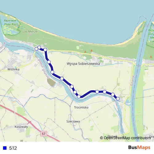 The first stop of the 512 bus route is Przegalina 01 and the last stop is Sobieszewo 01. 512 is operational during on weekdays.