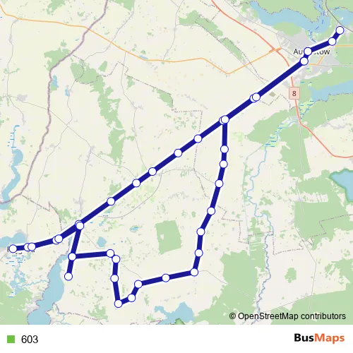 The first stop of the 603 bus route is Augustów D.A. and the last stop is Augustów, Komunalna (DG 102447b). 603 is operational during on weekdays.