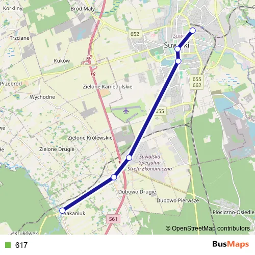 The first stop of the 617 bus route is Bakaniuk (DW 655)(13/14) and the last stop is Suwałki D.A.. 617 is operational during on weekdays.