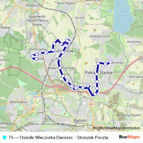 The first stop of the 73 bus route is Osiedle Wieczorka Dworzec and the last stop is Stroszek Poczta. 73 (Osiedle Wieczorka Dworzec - Stroszek Poczta) is operational during everyday.
