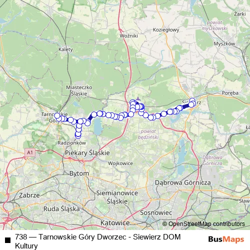 The first stop of the 738 bus route is Siewierz Dom Kultury and the last stop is Tarnowskie Góry Dworzec. 738 (Tarnowskie Góry Dworzec - Siewierz DOM Kultury) is operational during everyday.