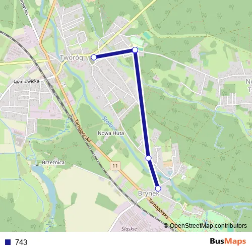 The first stop of the 743 bus route is Brynek Zamkowa and the last stop is Tworóg Kościół. 743 is operational during on weekdays.