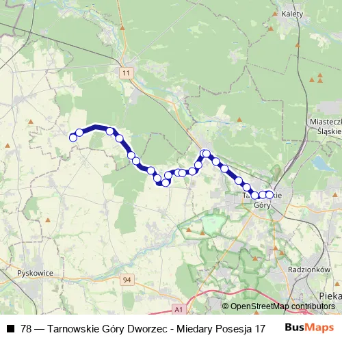 The first stop of the 78 bus route is Wojska Szkoła and the last stop is Tarnowskie Góry Dworzec. 78 (Tarnowskie Góry Dworzec - Miedary Posesja 17) is operational during everyday.