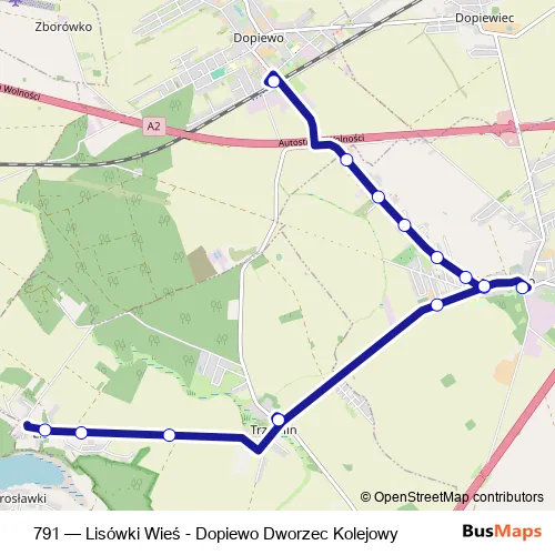 The first stop of the 791 bus route is Lisówki/Wieś and the last stop is Dopiewo/Dworzec Kolejowy. 791 (Lisówki Wieś - Dopiewo Dworzec Kolejowy) is operational during on weekends.