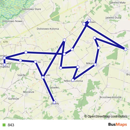 The first stop of the 843 bus route is Jaświły DP 1412b and the last stop is Jaświły DP 1412b. 843 is operational during on weekdays.