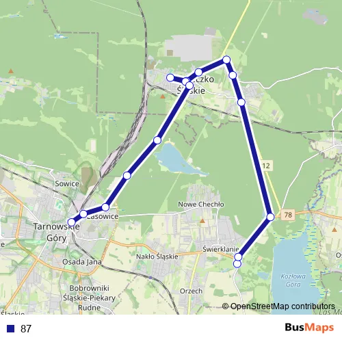 The first stop of the 87 bus route is Świerklaniec Park and the last stop is Tarnowskie Góry Dworzec. 87 is operational during everyday.