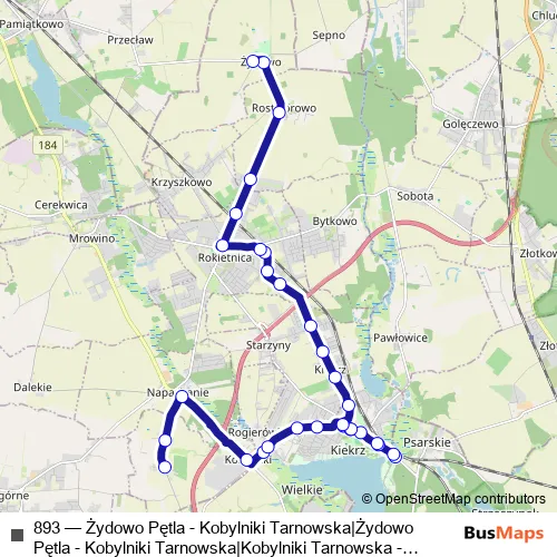 The first stop of the 893 bus route is Kobylniki/Tarnowska and the last stop is Żydowo/Pętla. 893 (Żydowo Pętla - Kobylniki Tarnowska|Żydowo Pętla - Kobylniki Tarnowska|Kobylniki Tarnowska - Żydowo Pętla|Kobylniki Tarnowska - Żydowo Pętla) is operational during everyday.