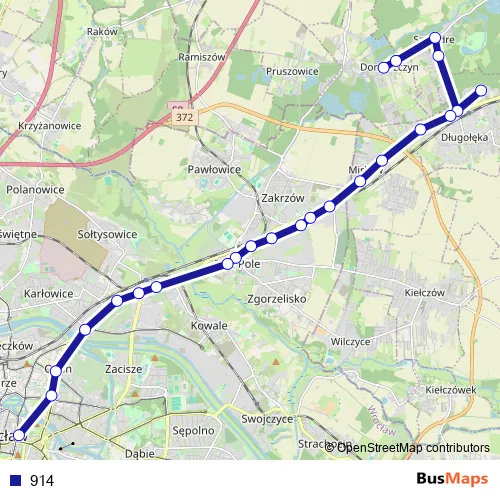 The first stop of the 914 bus route is Domaszczyn and the last stop is Galeria Dominikańska. 914 is operational during everyday.