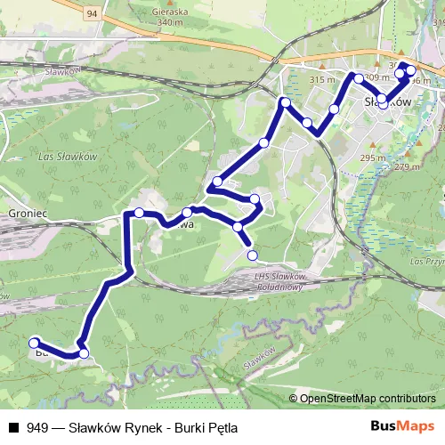 The first stop of the 949 bus route is Sławków Rynek and the last stop is Burki Pętla. 949 (Sławków Rynek - Burki Pętla) is operational during everyday.