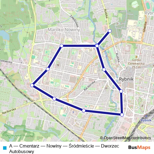 The first stop of the A bus route is Rybnik Dworzec Autobusowy and the last stop is Rybnik Północ Rudzka Cmentarz. A (Cmentarz — Nowiny — Śródmieście — Dworzec Autobusowy) is operational during everyday.