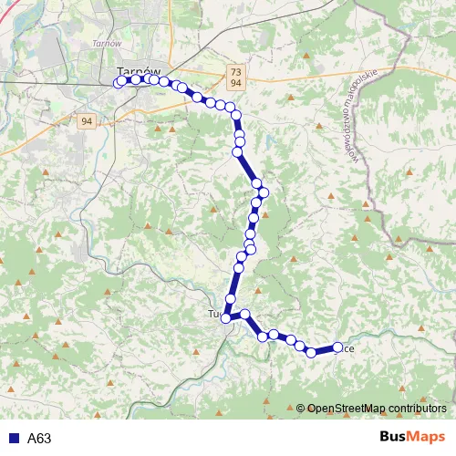 The first stop of the A63 bus route is Tarnów Dworzec Autobusowy and the last stop is Ryglice Rynek. A63 is operational during everyday.