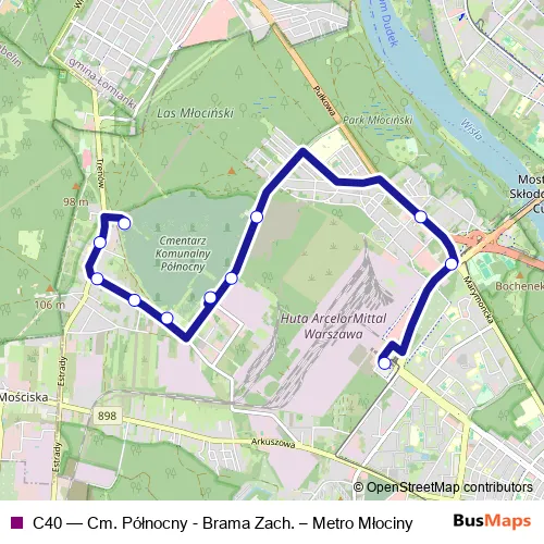 The first stop of the C40 bus route is Cm. Północny - Brama Zach. and the last stop is Metro Młociny. C40 (Cm. Północny - Brama Zach. – Metro Młociny) is operational during on weekends.